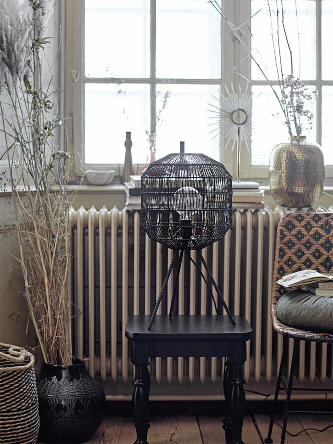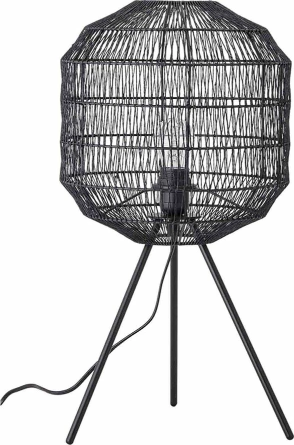 Sort 3 benet bordlampe med skærm der er lavet af papir på metal ramme. Sort plasticledning på 2,0M med tænd/sluk funktion, max 40W, fatning E27.