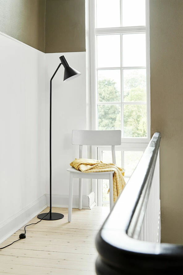 Indlysende enkel lampe til gulvet. Lampeserien LYSS trækker på dansk designarvs fineste dyder med sin indlysende, minimalistiske form og fuld fokus på funktionalitet. En skærm, en arm og en fod. Det er i princippet elementerne til en gulvlampe. Men når FRANDSEN RETAIL med 50 års erfaring i baghånden formgiver hver af de tre elementer med største omhu og skaber et sjældent harmonisk hele, så får du en lampe, der er hævet over flygtige trends. Den koniske skærm med reflekterende, hvid inderside sørger for, at lyset kastes lige derhen, hvor du behøver det. Mellem skærm og arm sidder et vippeled, og ender i en enkel fodplade med tyngde nok til, at lampen står stabilt. Lampen er monteret med praktisk fodafbryder og tekstilledning for at fuldende det enkle, monokrome look. LYSS i mat lysegrå og mat sort passer i de fleste indretninger, mens den varmt gullige ’mat almond’ står særligt flot til netop den danske designguldalders varme træsorter som teak, røget eg og palisander. Designer: Frandsen Design Studio Lyskilde: Der medfølger ikke pære, når du køber lampen. Denne købes separat. Fatning: E27. Max. 25 watt. Ønsker du at tilslutte lysdæmper til lampen, skal du være opmærksom på at bruge en pære, der kan tåle tilslutning til lysdæmpning. FRANDSEN RETAIL: Frandsen Retail A/S har skabt og markedsført et bredt sortiment af designlamper siden 1968. Mange af Frandsens lamper er blevet nutidige klassikere.