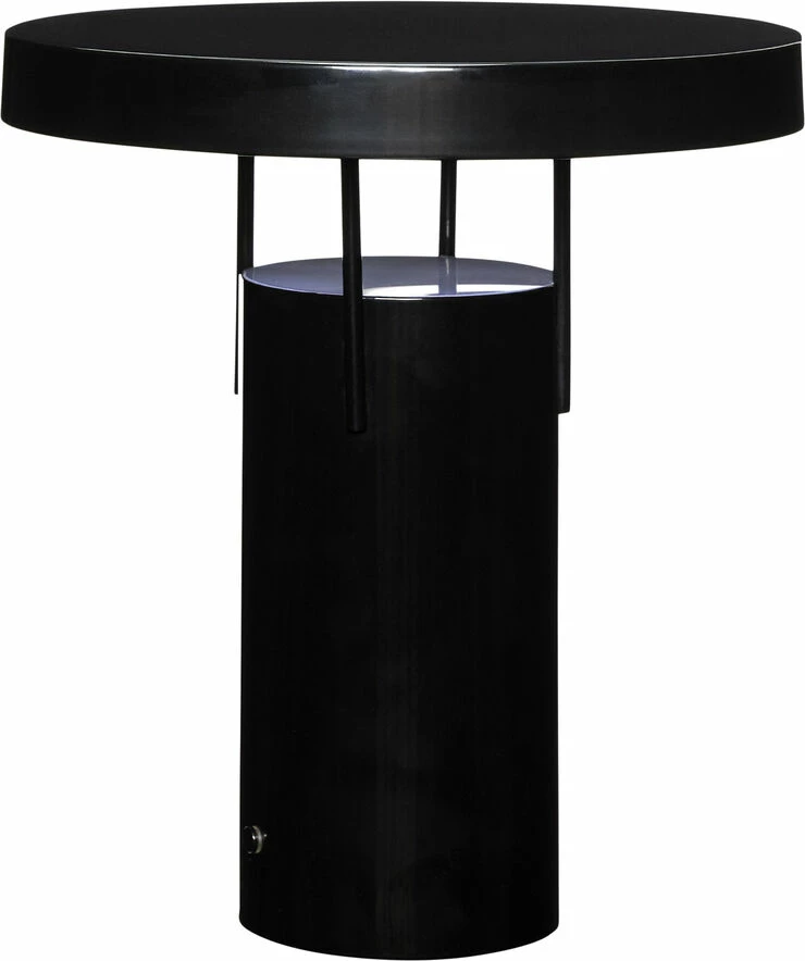 Genopladelig bordlampe til indendørs og udendørs brug med tænd-sluk og lysdæmpende touch-funktion. Farven er sort blank pulverlakeret metal.