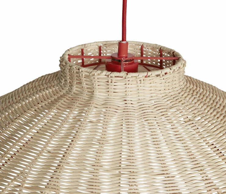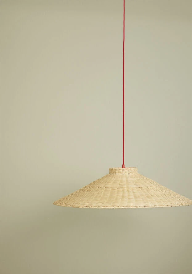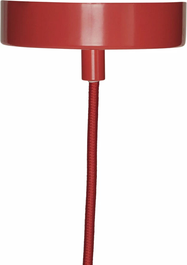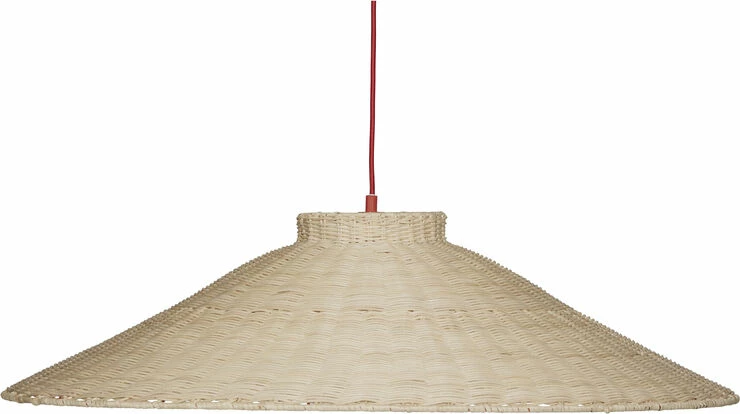 Stor loftslampe i trapez-form med rød stofledning.