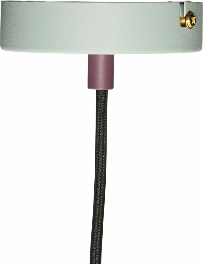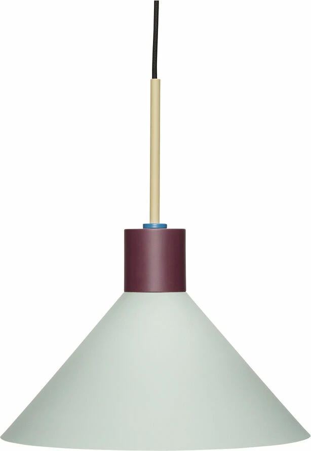 Flerfarvet loftslampe med mintfarvet skærm og bordeaux, blå og sandfarvet fatning.