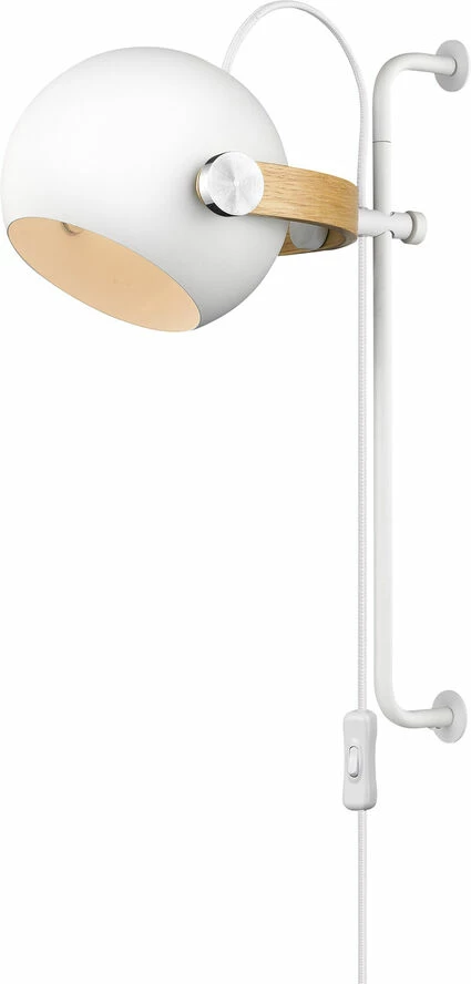 DC væglampe på bøjle i metal med træ deko-beslag i ægte træ. DC er en helt unik lampe-serie tegnet og designet i samarbejde mellem Michael Waltersdorff og Emanuele Patton. DC er et gennemført design af dansk når det er bedst og et touch af det italienske fra Emanuele. Med denne væglampe får man en metal lampe med drejeligt hoved dels sideværts som op og ned. Desuden kan man justere lampens højde på stangen, så man får lystet præsict der hvor man ønsker. Det er nemt at fpå installeret denne væglampe med denne type monteringsbeslag. En super flot kombination mellem metal og træ, qua beslaget der er udført i rigtig træ og med aluminiums skruer på siden, der giver en smuk kontrast. Kablet er i tekstil og her har man sikre enkeltheden til at betjene lyse ved at placere afbryderen på kablet med en så man kan tænde og slukke lampen nemt og enkelt. der er rig mulighed for at skabe det helt rigtige lys i hjemmet da der er anvendt E27 fatning, så nu kan der vælges alt op til 40 watt. DC serien findes i flere varianter og størrelser samt 2 farver Dansk design kvalitet – ingen kompromis.