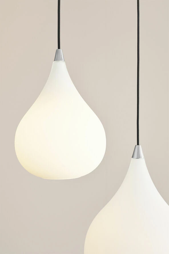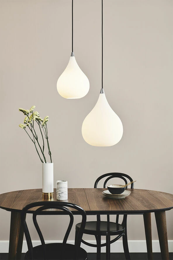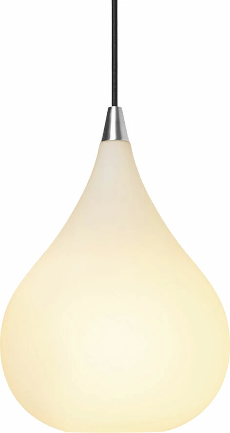 Drops fra Halo Design, er en god klassisk pendel i opal farvet glas, som med kvalitet er produceret i Europa, netop for at kunne tilsikre de rene fine linjer denne pendel besidder. Med det opale 2.lagsglas får man en lampe i tidsløst design, med et design af Michael Waltersdorff og som nem vil kunne give hjemmet et pift af moderne stil. Lyset bliver kastet ensartet ud i rummet qua denne type glas. Den er med standart fatning som giver frit spil for at kunne lave den lysmængde man måtte ønske. Desuden har man kunne lave en fantastsik flot overgang fra glasset til ophænget i børstet metal, for så at afslutte med prikken over i´et i form af sort stofkabel. Her får man virkelig meget lampe for pengene, Drops findes i størrelserne Ø17cm, Ø23cm, Ø30cm, samt i Ø38cm og tillige i flere modeller.