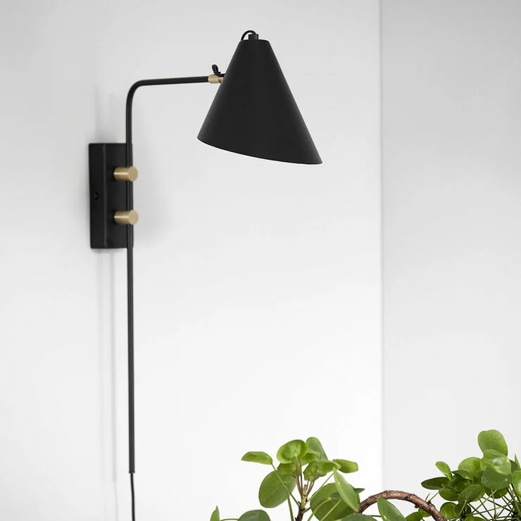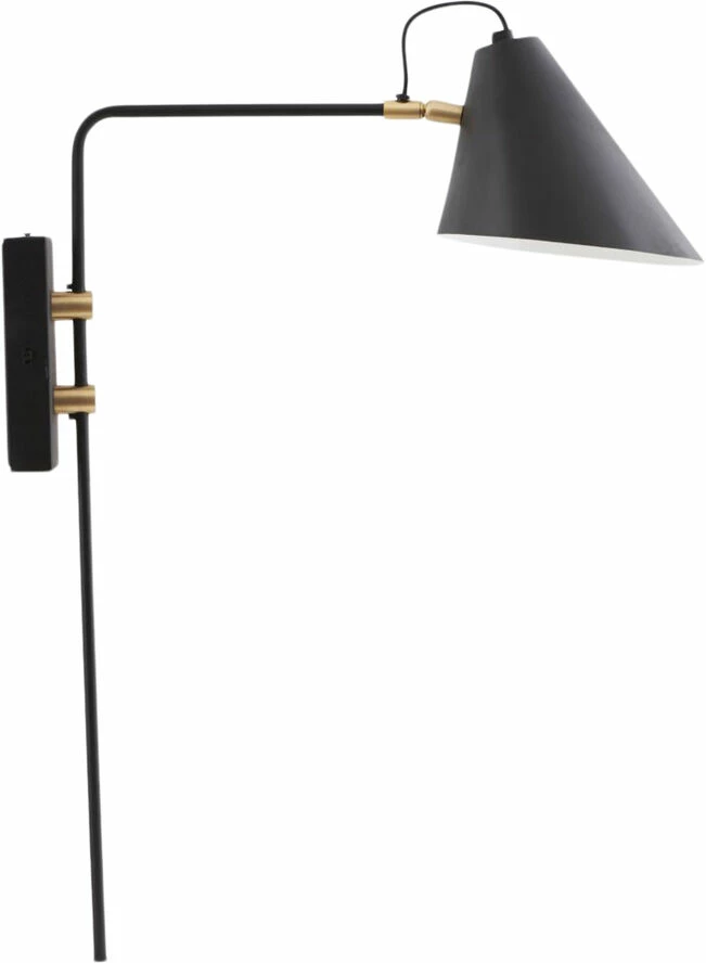 Lamper giver stil og personlighed til din indretning. Med den dekorative væglampe Club fra House Doctor får du både et stemningsfuldt lys til dit rum og en flot udsmykning til væggen. Lampen har et industrielt og skulpturelt udtryk, der giver et smukt resultat i indretningen. Kombinationen af sort jern og gyldent messing giver samtidig designet et varmt twist. Lampen har flere funktioner. Lampehovedet kan vippes op og ned og fra side til side. Armen kan bevæges fra side til side. Det giver dig mulighed for at justere lyset efter behov. Pæren følger ikke med. Køb en E27, max 25 W pære separat. Ledningens længde: 2,5 m. Længde fra lampe til tænd og sluk-knap: 50 cm.