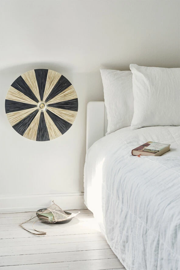 Lampen er samtidig dekorativ, og raffia giver varme til indretningen.