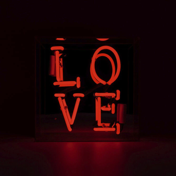 Neonskilt fra Locomocean med det flotteste look. Neonskiltet består af bogstaverne ‘LOVE’ bøjet i neonrør på en baggrund af spejlglas. Derudover er skiltet omkranset af en klar akrylkasse, der danner en flot ramme om produktet.