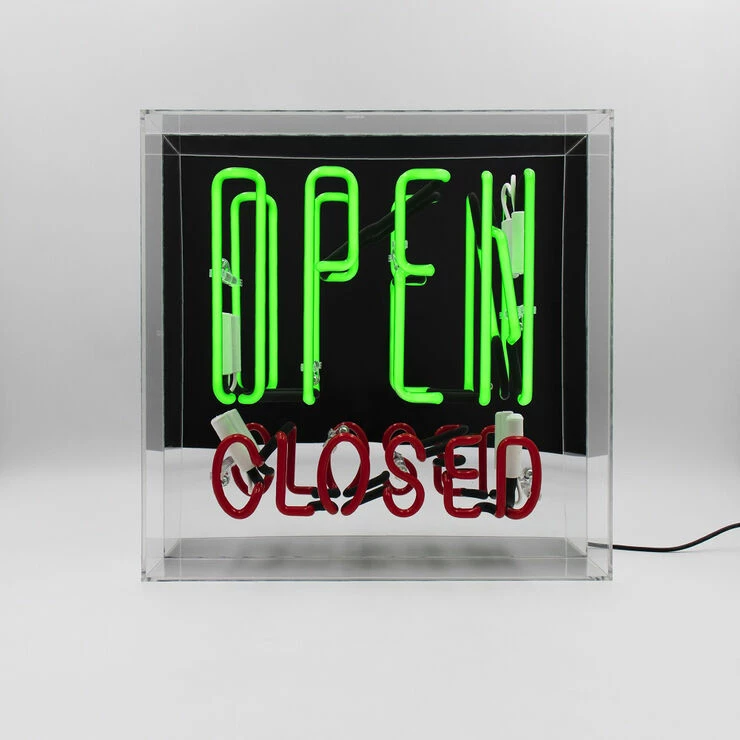 Det berømte neonboks-skilt er en klassiker. Skiltene fås i 80 forskellige varianter, så der er et design for alle, som ønsker et retro-glam-look til hjemmet, kontoret eller ethvert andet lokale, som kunne bruge et sjovt og farverigt budskab. Boksene er håndlavet ved hjælp af den traditionelle glaspustningskunst og er i unikke og strålende neonfarver. Boksene har en lang levetid og er energivenlige. De leveres med 12V DC UK / EU-transformatorstik og bruger kun 12-24W. Alle boksene er blevet testet, er sikre og bliver ikke varme. Boksskiltene laves i kvalitetsmaterialer: Glasset er omringet af skinnende gennemsigtigt akryl med spejlbaggrund og kan placeres på enhver overflade. Dette neonboks-skilt viser teksten OPEN/CLOSED i grøn og rød skrift inde i en gennemsigtig akrylboks. De to ord kan tændes individuelt. Dimensionerne: 35x24x10,5 cm.