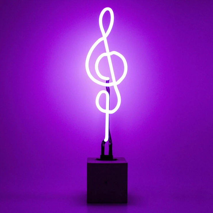 Dekorer dit hjem eller kontor med disse farverige, glødende glasneonskilte på en stilfuld betonbase. Disse unikke, charmerende og frække designs oser af den ægte retrovibe. Der er mere end 30 forskellige designs i alle mulige farver og størrelser. Glasset er håndlavet ved hjælp af den traditionelle glaspustningsteknik og kan nemt skiftes ud. Glassene kan købes separat, så det er bare at vælge hvilke designs man bedst kan lide og skifte dem ud i henhold til det humør man er i. Boksene har en lang levetid og er energivenlige. De leveres med 12V DC UK / EU-transformatorstik og bruger kun 12-24W. Alle boksene er blevet testet, er sikre og bliver ikke varme. Neonskiltene laves i kvalitetsmaterialer og kan placeres på enhver overflade. Denne neonlampe viser en lilla g-nøgle. Dimensionerne: 12x46x9 cm.