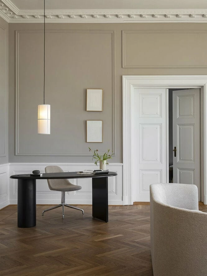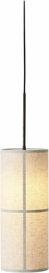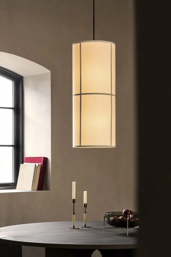 The collections pendant light is created with the same column-like shape as the floor and table lamp, carefully covered with translucent fabric that reveals the graphic structure within and suspended from the ceiling by a textile cord. Spreading ambient light in a room, it makes a purposeful pendant above a dining table, in a reception area or hotel bedroom. [dimensions-start] Small: H: 45 cm (60 cm), Ø: 18 cm Large: H: 75 cm (90 cm), Ø: 30 cm [dimensions-end] [materials-start] Light Bulb Socket: E27 No bulbs included [materials-end] [additional-resources-start] DOWNLOADS PRODUCT FACT SHEET 2D/3D FILES ASSEMBLY INSTRUCTIONS [additional-resources-end]