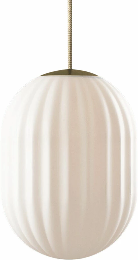 Lampen er lavet af en mundblæst kuppel i hvid opal glas med en gylden messing fatning, som er en perfekt kombination.