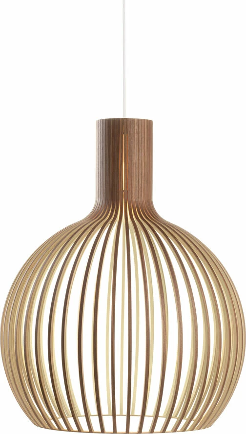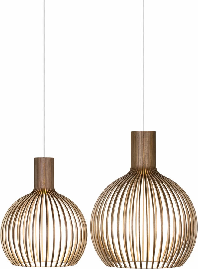 Octo 4240 Pendlen er allerede blevet en klassiker i de skandinaviske hjem. Octo Pendlen er en stor, men samtidig meget luftig pendel, som på trods af sin størrelse passer rigtig godt ind i små rum. Den er også yderst velegnet til over spisebordet. Det er en lampe, som spreder et varmt og hyggeligt lys over et stort område. Lampens design er lavet ud fra et innovativt brug af træ samt et godt gedigent håndværk. Det er skandinavisk design som er kombineret med et godt træhåndværk. Pendlen gemmer diskret på lyskilden, og blænder derfor ikke.