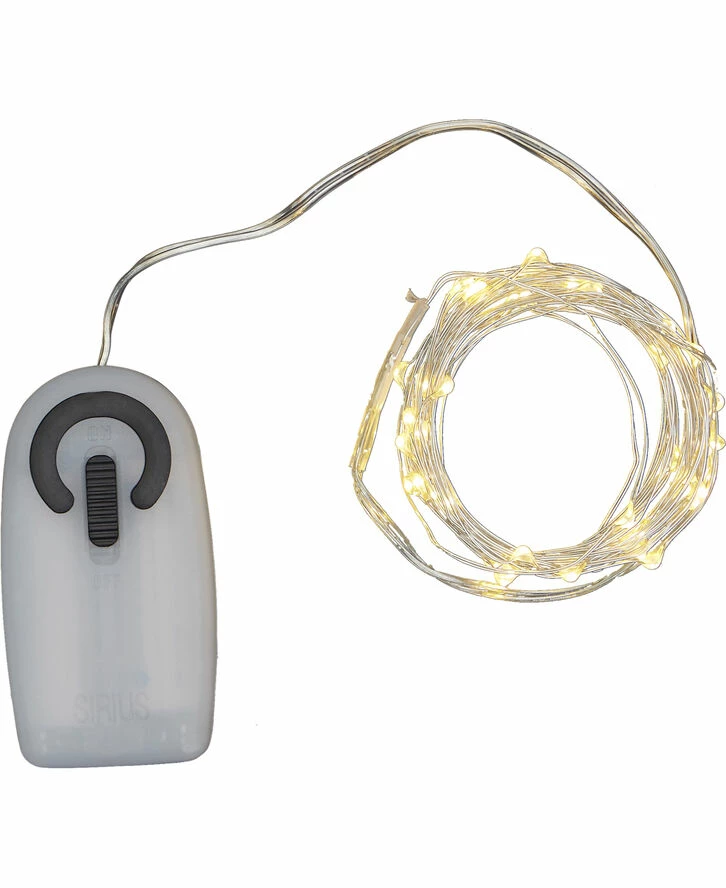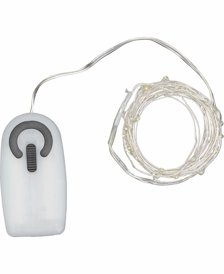 Sirius Batteri-Lyskæden Knirke har 40 meget små fine (0,5 cm) LED lys. Kæden er lavet med en fin sølvtråd der er snoet rundt om den transprarente ledning. Meget dekorativ kæde. Kæden er 3,9 meter lang, og har et varmt naturligt lys. Dekorationen er batteridrevet og har en indbygget timerfunktion, der slukker lyset automatisk efter 6 timer, hvis du ikke selv slukker dem. Efter 18 timer tænder lyset igen, og sådan vil det fortsætte, hvis du ikke bruger sluk knappen. Batterier medfølger ikke. Der skal isættes 2 AA Batterier. Kan kun benyttes indendørs.