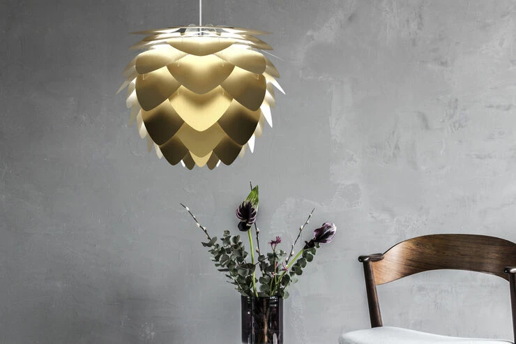 Inspireret af naturen med sine karakteristiske trekantede kronblade, kaster Aluvia i b›rstet messing et varmt og bl‘ndende omgivende lys, der ser lige s† godt ud, som det t‘nder.