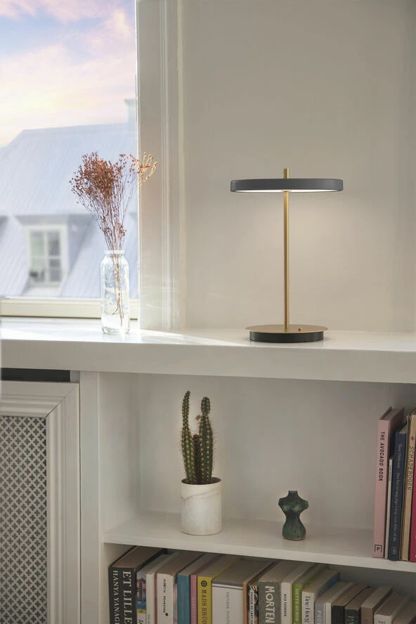Asteria Move er en flytbar lampe helt uden ledninger, som giver et ekstra fokus til designets detaljer og gør den nem at have med sig, når man bevæger sig rundt i hjemmet. Lampen har et indbygget LED-panel med en hvid diffusor, der sikrer en behagelig belysning i rummet. Asteria Move har tre lysintensiteter der kan justeres via knappen på lampens base. Batteriets holder helt op til 35 timer og den kan nemt oplades ved at placere den oven på en hvilken som helst Qi-opladningsenhed som Unifier fra UMAGEs belysningstilbehør eller med det medfølgende USB-kabel