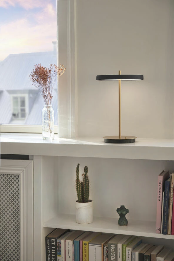 Asteria Move er en flytbar lampe helt uden ledninger, som giver et ekstra fokus til designets detaljer og gør den nem at have med sig, når man bevæger sig rundt i hjemmet. Lampen har et indbygget LED-panel med en hvid diffusor, der sikrer en behagelig belysning i rummet. Asteria Move har tre lysintensiteter der kan justeres via knappen på lampens base. Batteriets holder helt op til 35 timer og den kan nemt oplades ved at placere den oven på en hvilken som helst Qi-opladningsenhed som Unifier fra UMAGEs belysningstilbehør eller med det medfølgende USB-kabel